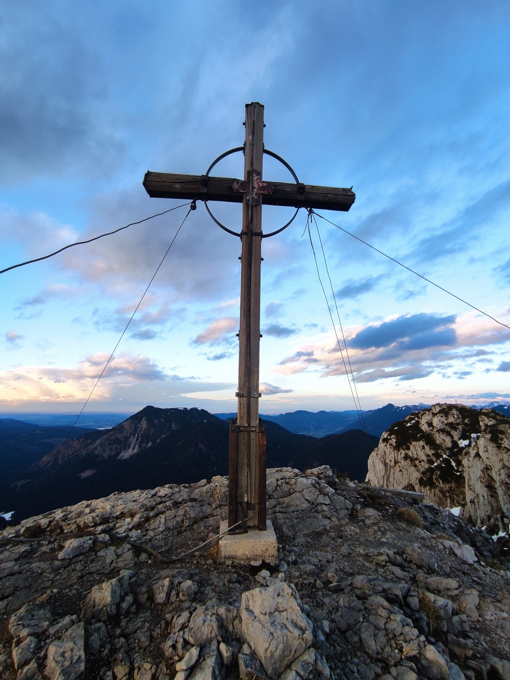 Ab der Roßsteinalm gehen wir auf den Roßstein am Grat entlang zu und folgen der Trittspur durch die letzten Bäume. In den Latschen geht es über den Fels in leichter Kraxelei (I Grad) zum Gipfelkreuz.