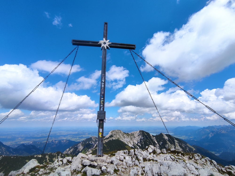 Helm und Klettersteigset kann nun wieder weg, denn es geht leicht weiter zum Hallergernjoch. Hier könnte man bereits links den Abstieg angehen, wer noch Kraft und Lust hat, nimmt aber die Läuferspitze noch mit, vor und hinter dessen Gipfel man nochmal kurz aber beherzt ins Stahlseil langen muss.