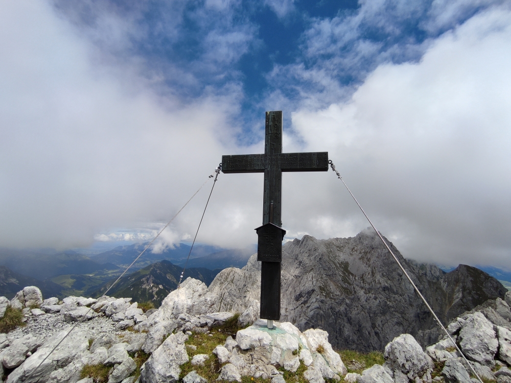 Sehr lange Tour (hier mit entschärft mit dem Kaiserlift) über den leichten Klettersteig zum Kletterstellen im II Grad gilt es auf Grat zu überwinden.