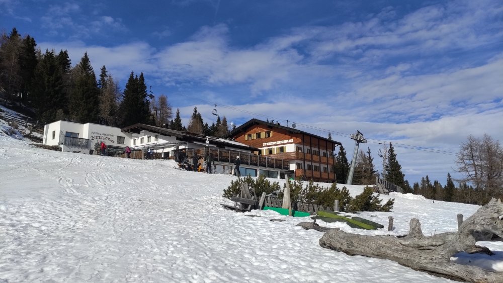 Wer noch aussichtsreich einkehren will kann seinen Schlitten an der Bergstation deponieren und nach rechts quer über die Piste gehen und zum Sterzingerhaus aufsteigen.