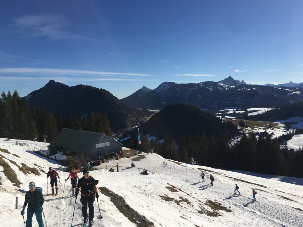 Viele Skitourengeher kommen hier auf dem Weg zum Wertacher Hörnle vorbei, was zugleich auch den Parkplatz im Tal schnell auslastet. Als Rodelbahn geht es auf der Forststraße etwas abseits durch den Wald zurück.