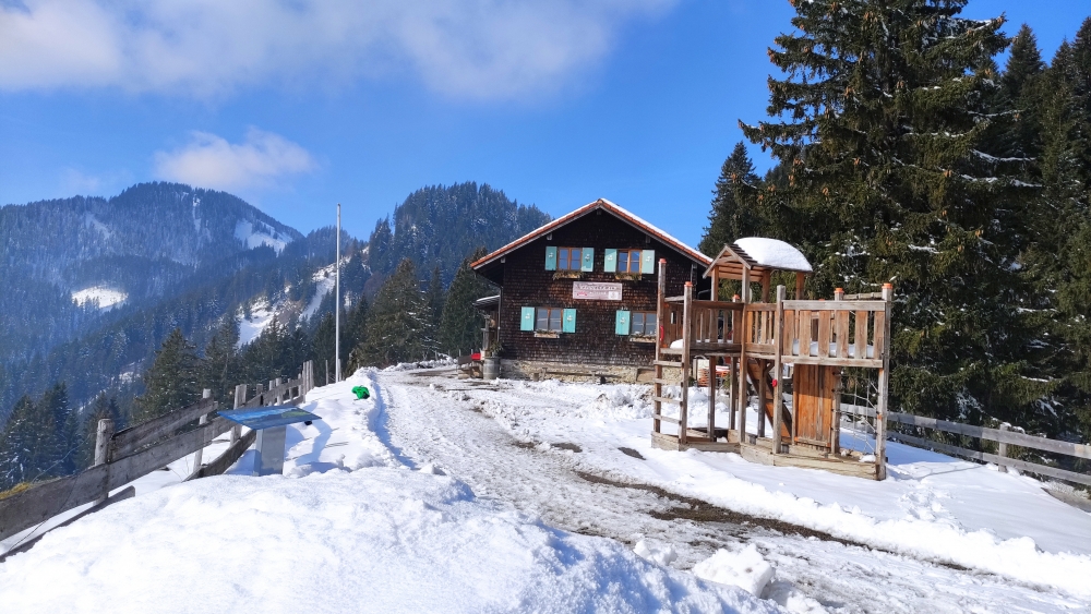 Hier am Parkplatz folgen wir der im Winter geräumten Forststraße bergauf. Wir folgen nun stets dieser Forststraße bis unter den Hündeleskopfs. Hier zweigt links ein Wiesenpfad ab, der uns zur Hündeleskopfhütte führt.