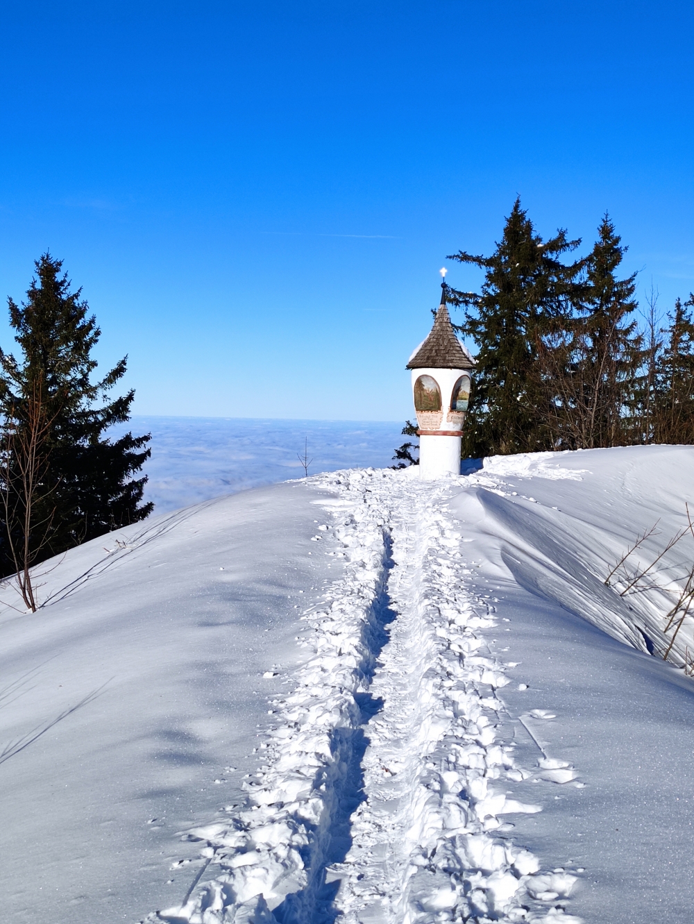 Da es wirklich nur ein Katzensprung ist, machen wir noch den 200m langen Abstecher zum Gipfel mit seinem Gedenkstein.