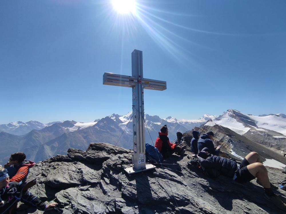 Von diesem Vorgipfel steigen wir nordwärts in den Sattel ab, wo wir auf die Zustiege vom Schöllijoch und der Turtmannhütte stoßen. Gemeinsam mit einigen anderen Wanderern steigen wir nun die letzten etwas steilen Meter über feinen Kies zum Üssers Barrhorn auf.