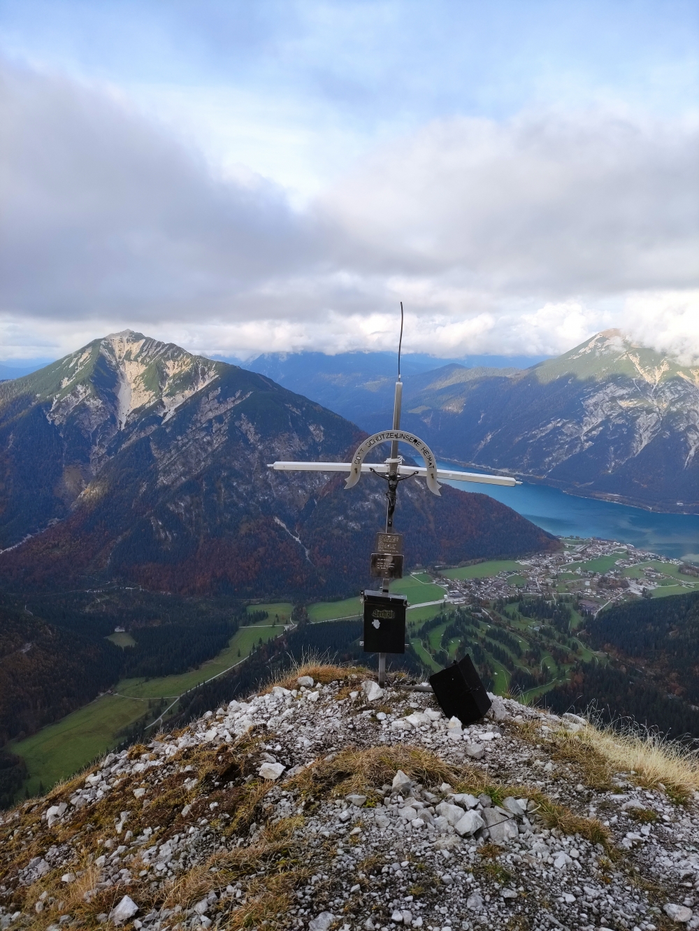 Im oberen Teil schwenkt der Weg nach links und führt dann über Gämsenwiesen in die Schuttflanke. Hier geht es auf nun über einen schmalen Steig mit einigem losen Gestein von hinten zum Gipfelkreuz mit tollem Blick über Pertisau und Achensee zum Rofan.