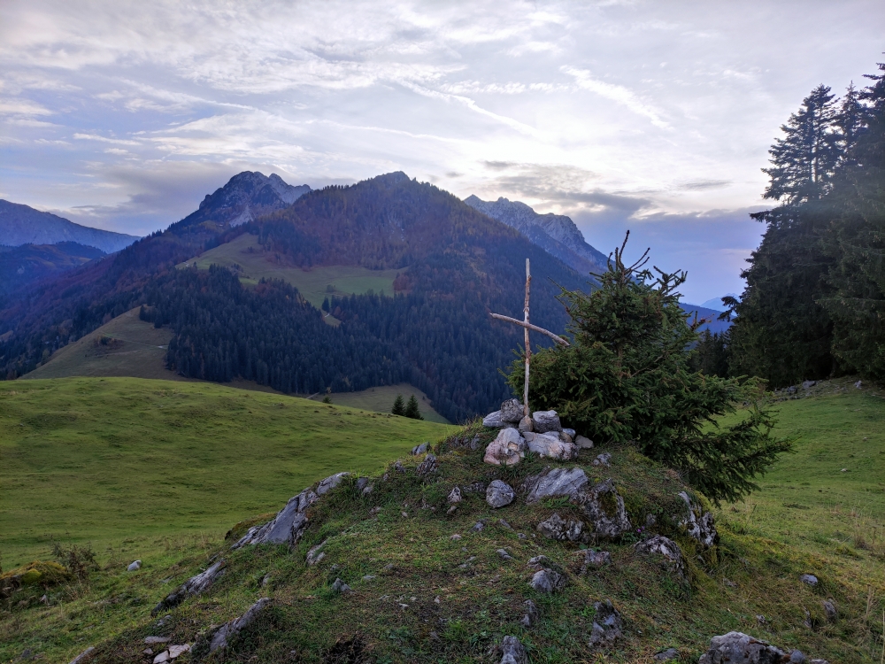 Über einen alten Hohlweg steigen wir auf zu den Wiesen rund um die Raineralm. Ab hier geht es aussichtsreich weiter auf Fahrstraßen bergauf zur Schwarzenbachalm. Hier kurz über die Wiese zum Zaun und an diesem die letzten Meter bergauf zum Gipfelplateau mit dem kleinen behelfsmäßigen Gipfelkreuz auf dem Ebersberg.