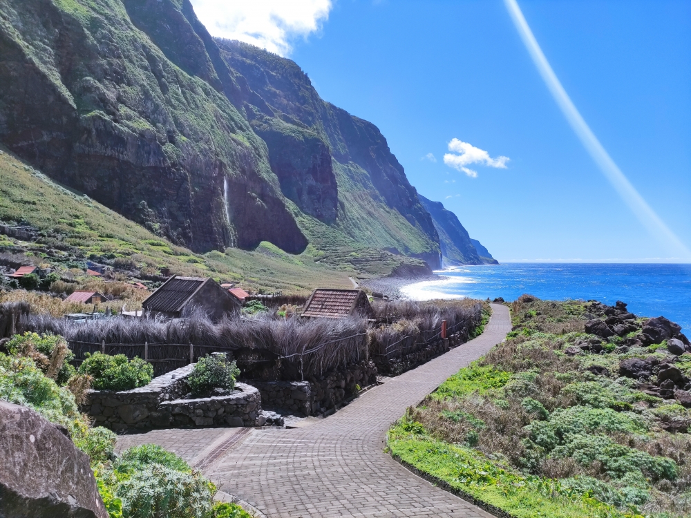 Am Aussichtspunkt Ponta da Ladeira befindet sich ein sehr kleiner Parkplatz - etwas oberhalb ein zweiter. Von der vorderen Spitze sehen wir bereits auf die Faja. Der Wanderweg beginnt jedoch NICHT hier, sondern wenige Meter vor dem kleinen Parkplatz und ist sogar mit einem Schild gekennzeichnet. Ein schmaler Weg führt hier zunächst südwärts leicht bergab an einem Steinhaus vorbei. Bald beginnen Serpentinen etwas westlich zu führen, um dann fast im Tal wieder gerade zur Brücke über den Bach, der von dem Wasserfall gespeist wird.