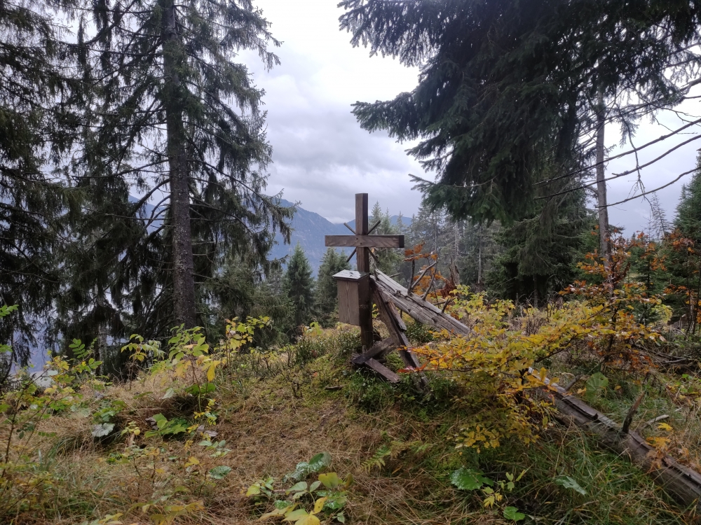 Ein kleines Gipfelkreuz mit Gipfelbuch ziert den Großer Laber, von dem der Ausblick ersteinmal nicht so berauschend ist. Wir folgen dem Weg weiter nach Süden an einem Gedenkkreuz vorbei und können hier schön nach links über das Loisachtal und rechts zur Notkarspitze blicken.