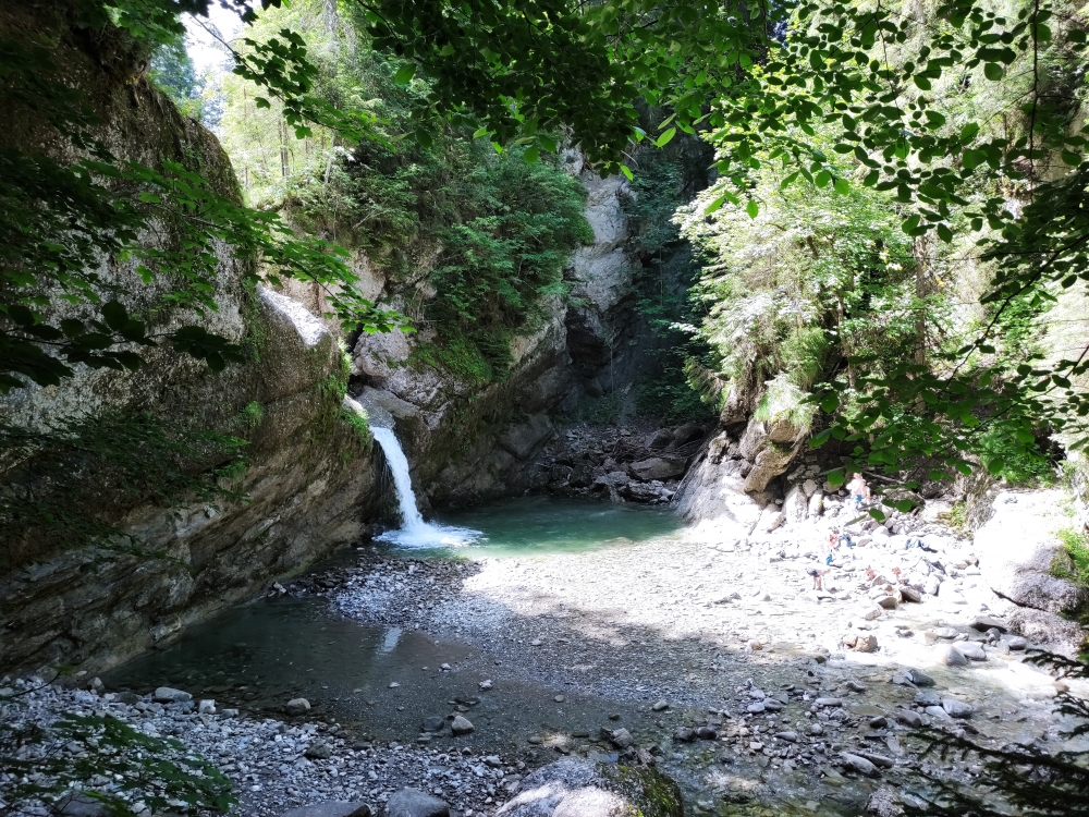 Start ist am Parkplatz Gunzesrieder Säge. Zunächst müssen wir zurück zur Straße und auf die andere Seite des Baches wechseln, bavor es angenehm schattig immer neben dem Wasser bergauf geht. Etwa in der Mitte fehlt (2022) eine Brücke und man muss die Schuhe ausziehen, um durch den Bach zu waten wenn man sich nicht an einem Stahlseil über den Bach hangeln will.