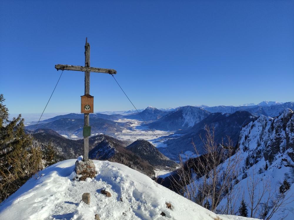 Wir erreichen die Almgebäude der Haaralm, wekche wir passieren und haben nun schon das Ziel, das Gipfelkreuz auf der Haaralmschneid hoch über den Wiesen vor Augen. Im Winter geht es mit Schneeschuhen oder Tourenski nun etwas steiler nach oben zu der Aussichtsloge mit tollem Blick nach Ruhpolding im Osten, Hochfelln im Norden, Hochgern im Westen und zur Hörndlwand im Süden.