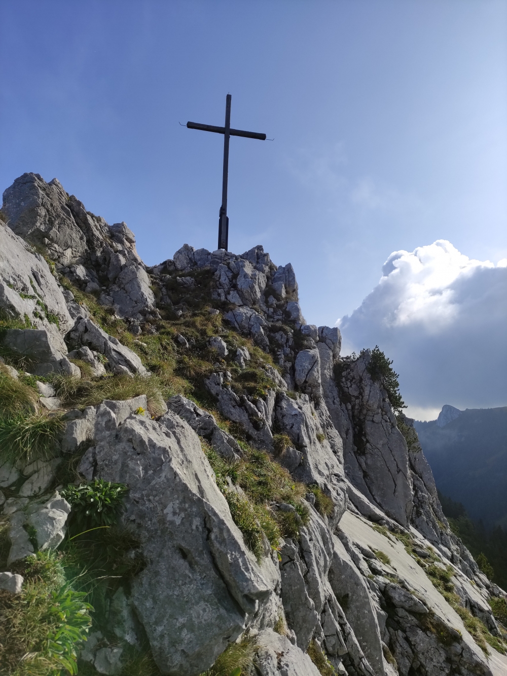 Wem die letzen Meter zum Gipfelkreuz in IIer Kletterei zu waghalsig sind bleibt lieber knapp unter diesem.