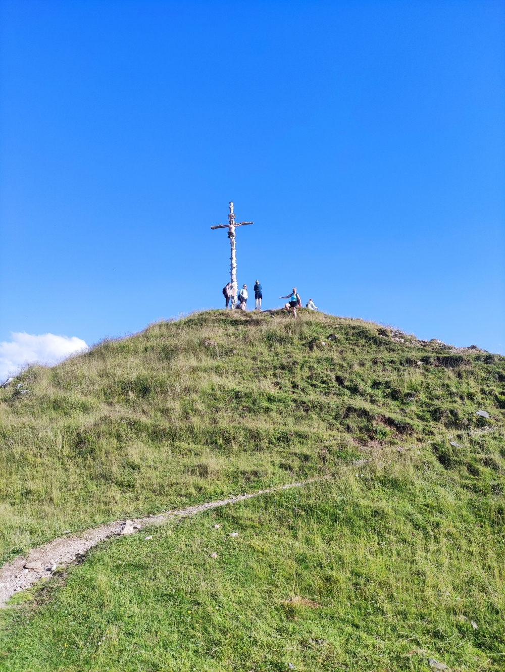 Am Gipfelkreuz angekommen können wir einen schönen Blick über das Murnauer Moos und den Staffelsee im Norden, sowie die benachbarten zwei Hörnle-Gipfel und die Ammergauer Alpen im Süden genießen.