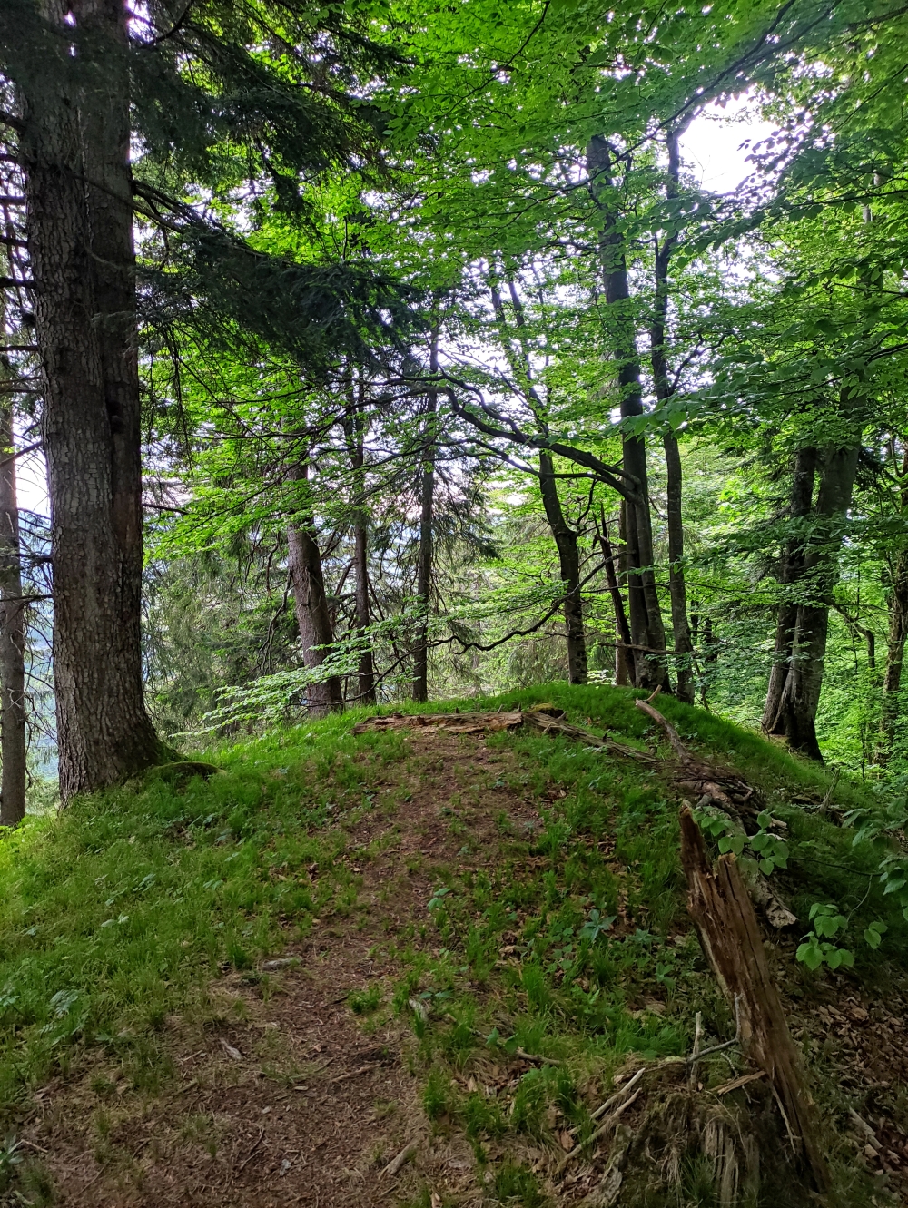 Sobald die Forststraße wieder deutlich bergab führt gehen wir rechts auf den etwas kleineren Karrenweg. Dieser bzw der kleine Pfad neben diesem führt uns nun über den Höhenberg. Fast hätten wir uns über das fehlende Gipfelkreuz und die mangelnde Aussicht beschwert aber schon bald erreichen wir auf dem Abstiegspfad den Aussichtspunkt "Am kleinen Paradies", der wahrlich ein solches ist.