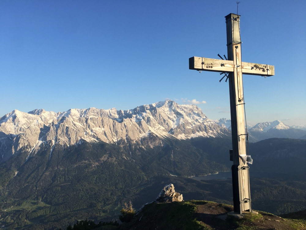 Toller Rundblick vor allem nach Süden über den Eibsee auf Alpspitze, Waxenstein und Zugspitze.