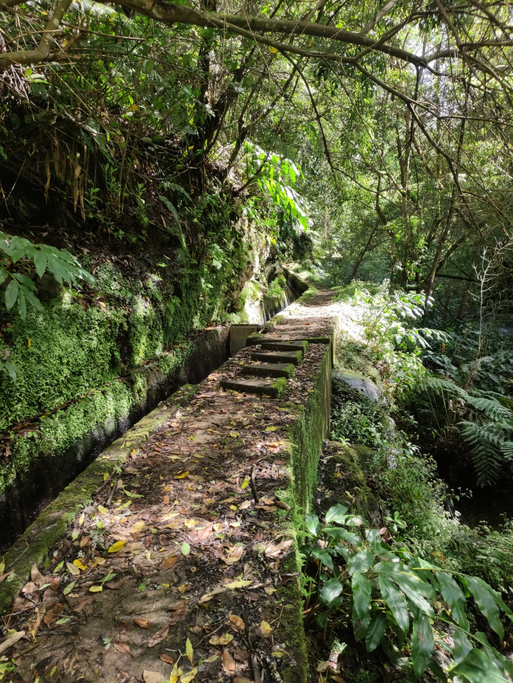 Wir starten am Ende der Sackgasse und gehen geradeaus talweinwärts weiter. Zunächst geht es auf einem breiten Karrenweg leicht bergauf, später dann stufig hinauf zur Levada dos Tornos. Dieser folgen wir nach rechts bis zu den Wegweisern. Geradeaus das letzte Stück ist uninteressant und so steigen wir rechts steil und erdig hinab zur Brücke über den Ribeira de Santa Cruz. Auf der anderen Seite können wir noch kurz einen Abstecher zur Start der Levada Nova machen. Mutige können auch über die Baumbrücken-Konstruktion auf die andere Seite wechseln um noch den Wasserfall gleich hinter der Biegung zu sehen.