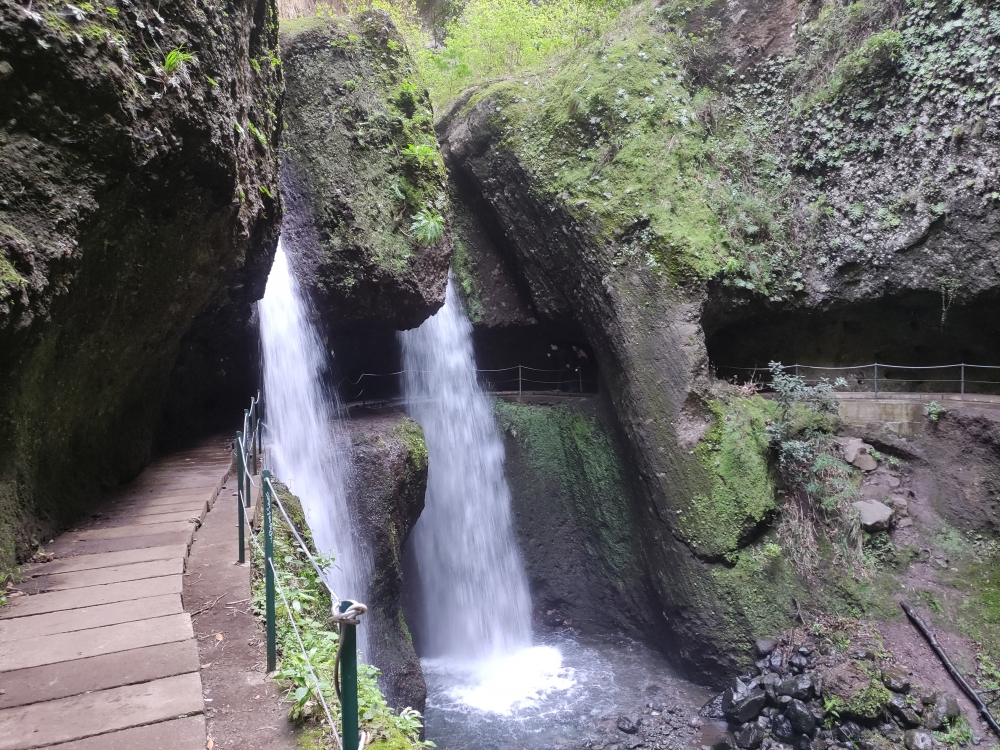 Auf der Levada Nova gehen wir wieder talauswärts und erreichen die berühmte, pitoreske "Hinterquerung" des Doppelwasserfalls des Ribeiro Frio.