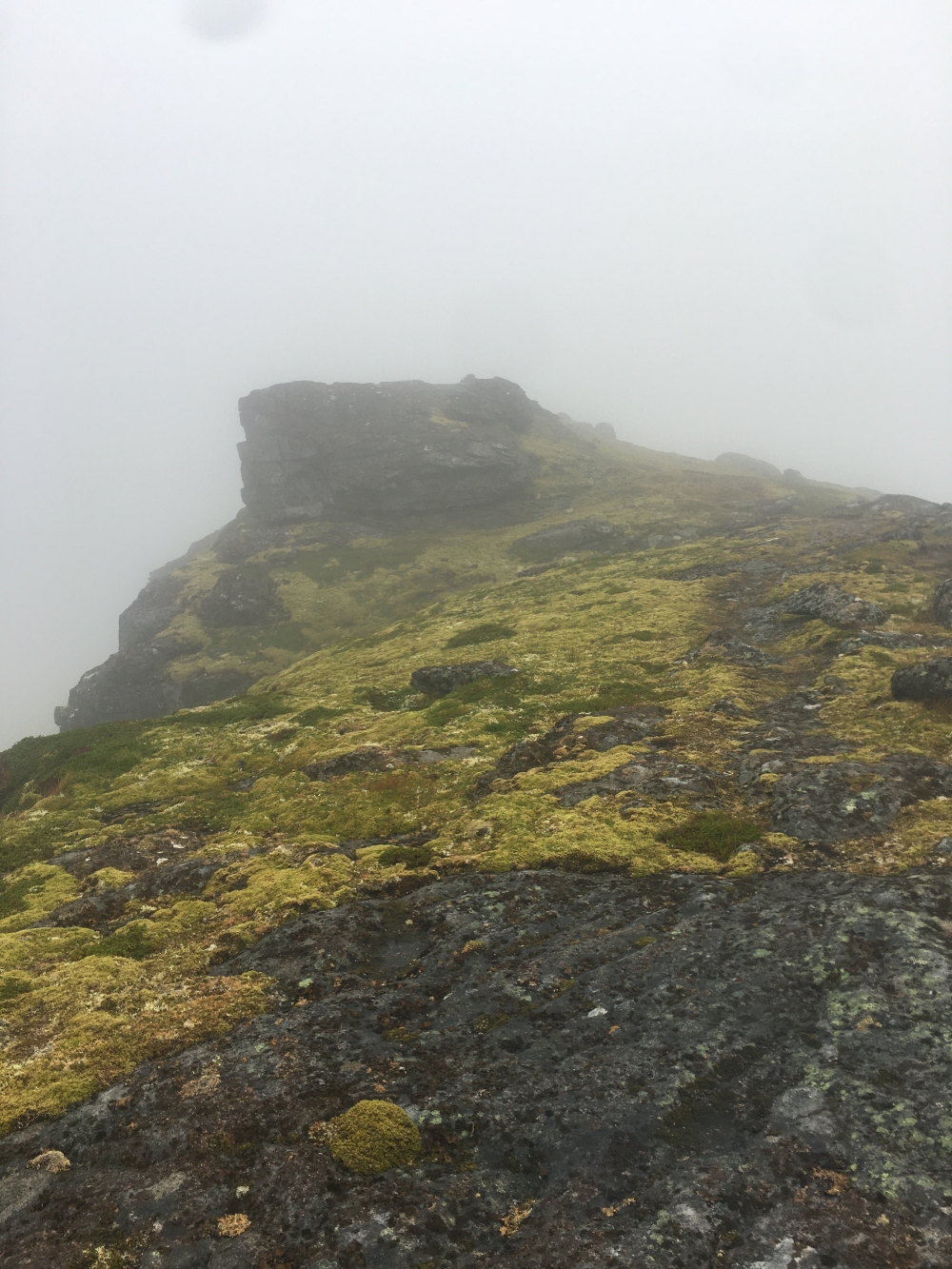 Der Pfad im nordseitigen Abstieg ist schwach erkennbar und erfordert leichte Kraxelei. Wir erreichen den Sattel unterhalb des Stokvika, dessen Grasgipfel wir noch einen kurzen Besuch abstatten können, bevor es in östlicher Richtung auf einem schmalen Pfad hinter zur Straße und zurück zum Ausgangsort geht.