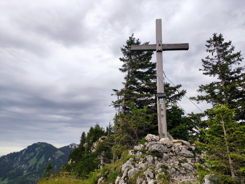 Die Felsnase des Mühlhördl gibt einen schönen Blick über das Priental von Chiemsee bis zum Kaisergebirge und Inntal frei.
