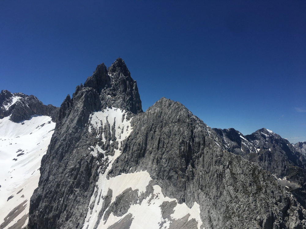 Wir queren über das Leutascher Platt unter den Gipfen der Partenkirchner Dreitorspitze nach Südwesten. Hier müssen wir nun entscheiden ob wir schwindelfrei, fit und erfahren genug sind, um noch den Westgipfel zu besteigen oder gleich weiter zum Söllerpass zu queren.