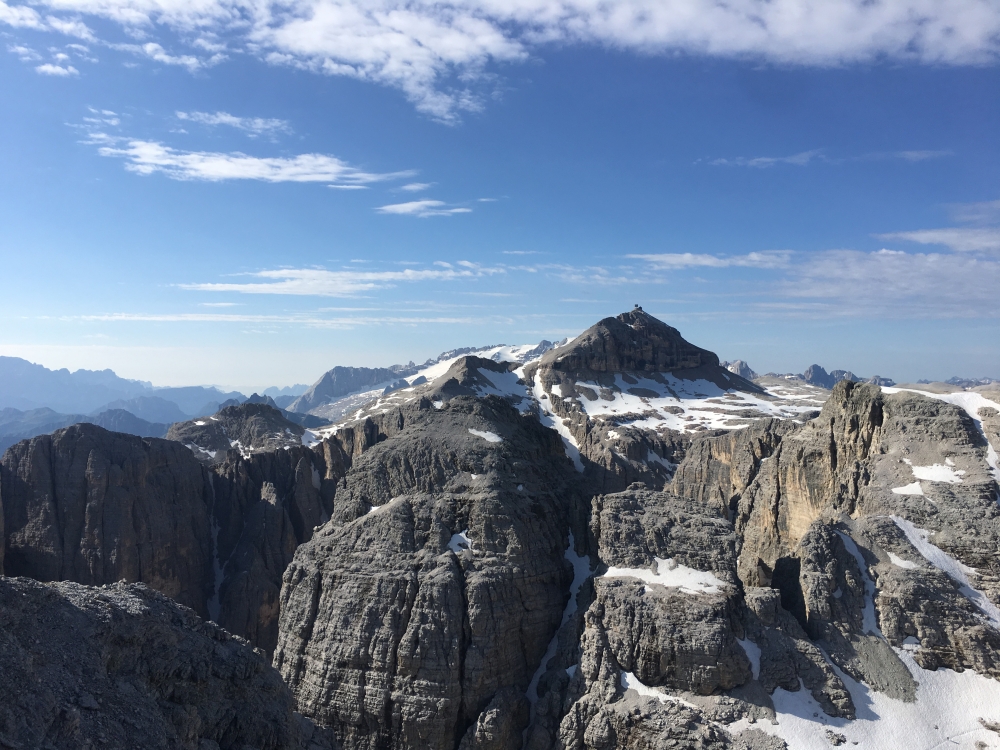 Wir Überschreiten den Piz Boe und steigen südwestlich Richtung Sass Pordoi ab, schwenken aber (nicht ganz leicht zu finden) baldmöglichst wieder nach Norden zum Rifugio Boe.