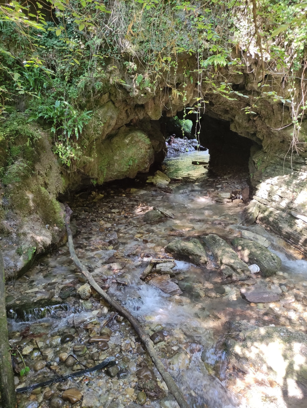 nach rechts können wir noch weiter absteigen und erreichen so das Bachbett in dem wir watend unter dieser natürlichen Brücke hindurchgehen können.