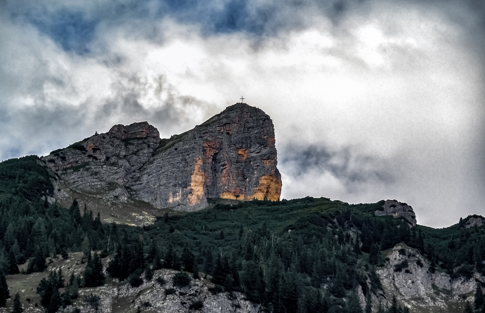 Im obersten Abschnitt der Tour und am Gipfel leichte Kletterstellen nah am Abgrund. Für Kinder nicht geeignet.