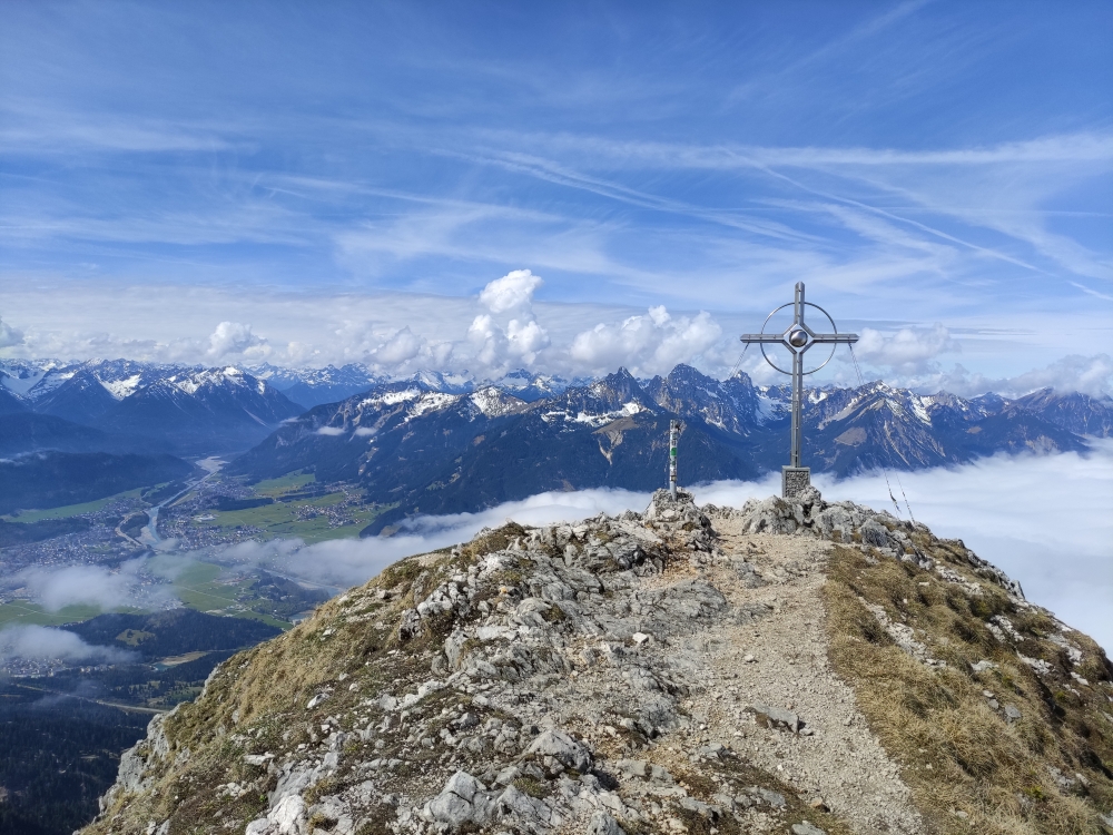 Im Sattel oben angekommen gehen wir rechts hinauf zum Gipfelkreuz, das wir von hier aus schon sehen. Die letzen Meter werden nochmals etwas herausfordernd und sind auch nicht mit Seilen gesichert.