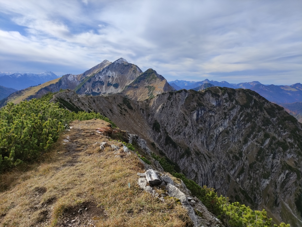 Nach dem Genuß der Aussicht nach Süden auf die (im Herbst schon verschneiten Bergspitzen) in Tirol und im Norden auf die Rotwand und dem Wendelstein geht es etwas näher an der Gratkante aber nicht schwierig und nicht allzu ausgesetzt Richtung Wildenkarjoch. Diese passieren wir unterhalb und steigen zur Wilderkaralm ab.