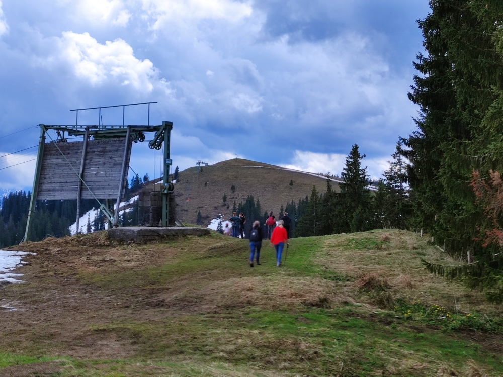 Wir steigen zur Jagahüttn ab - wer noch Zeit und Kraft hat, geht noch kurz weiter bis zum Roßkopf-Gipfel. Ansonsten geht es hier rechts über die Skipiste hinab und kurz darauf nach rechts durch den Wald zurück zur Forststraße, die wir bereits vom Anstieg kennen.