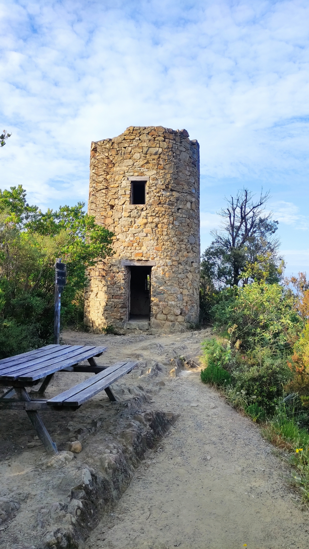 Am Bahnhof von Direkt nach diesem geht es links bergauf. Wir folgen den Wandermarkierungen nun stets ansteigend über eine Schotterstraße bis zu deren Ende. Der Weg führt nun als schmaler Fußweg weiter zu einem Wegweiser kurz vor dem Torre Punta Baffa. Diesen Turm, der in früheren Zeiten zur Ausschau nach Piraten genutzt wurde, besuchen wir aber natürlich und gehen rechts weiter.