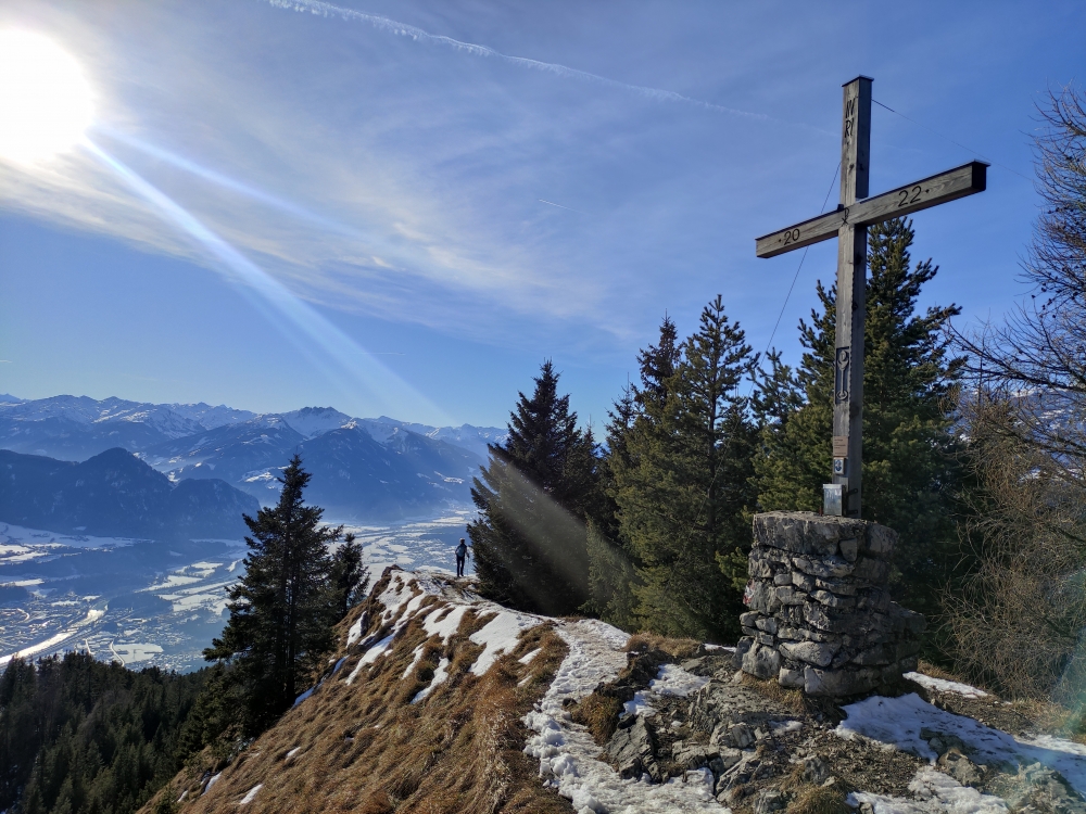 Rund 900 Höhenmeter und zweieinhalb Stunden später stehen wir am Gipfekreuz hoch über dem Inntal und blicken von Kaiser im Osten über das Alpbahtal im Süden bis zu den Rofangipfeln im Osten.